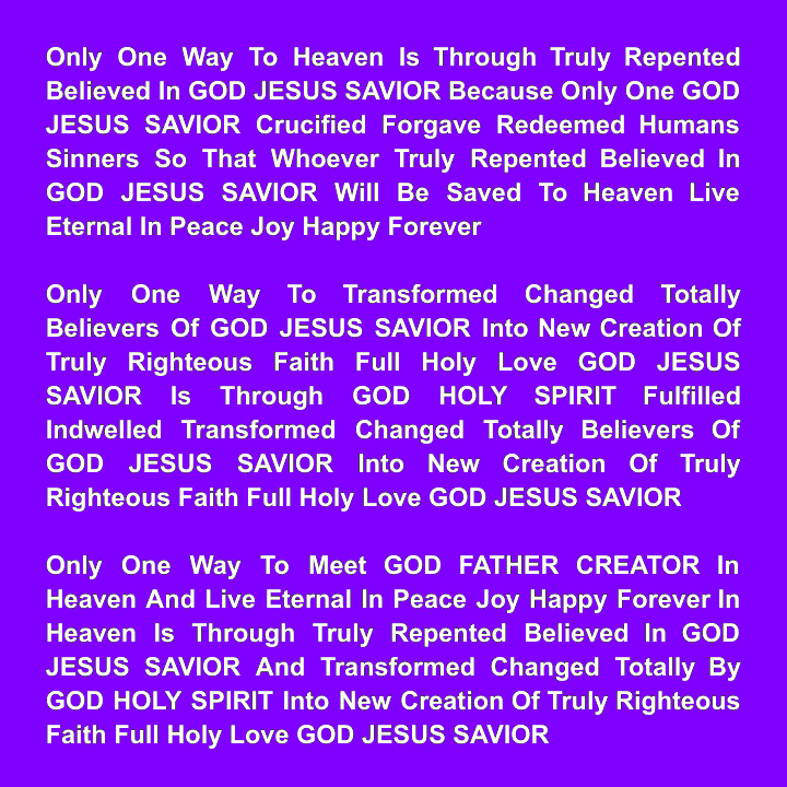 Only One Way To Heaven Is Through Truly Repented Believed In GOD JESUS SAVIOR Because Only One GOD JESUS SAVIOR Crucified Forgave Redeemed Humans Sinners So That Whoever Truly Repented Believed In GOD JESUS SAVIOR Will Be Saved To Heaven Live Eternal In Peace Joy Happy Forever